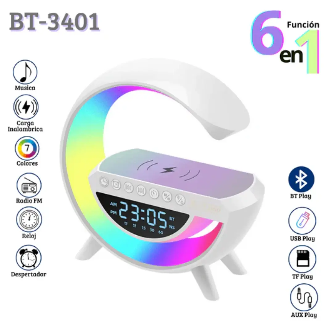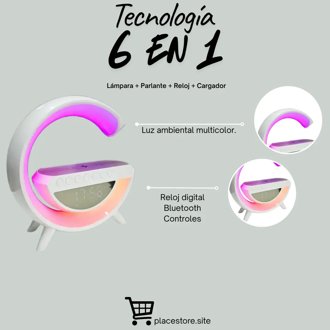 Lámpara 6 en 1: Luz, Música, Reloj y Carga Inalámbrica